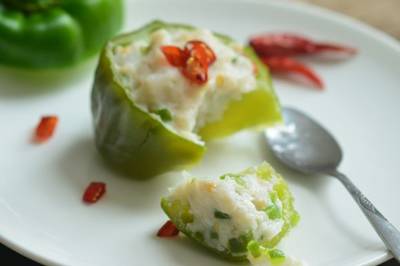 10.掏掉青椒的籽儿,把鱼肉灌进去