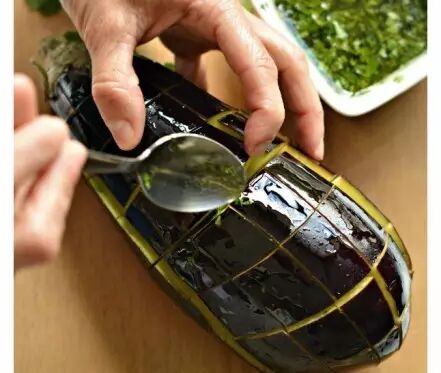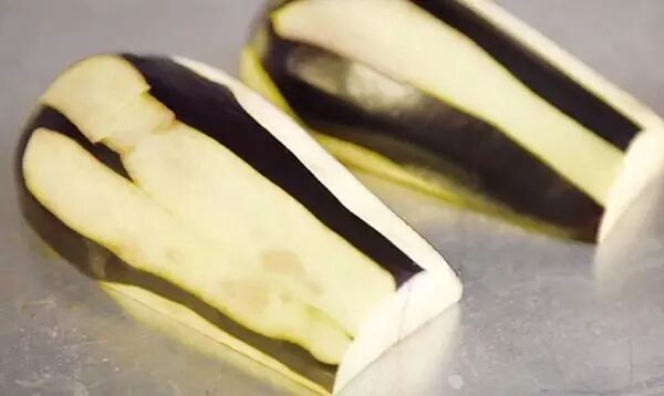 1、洗净茄子,擦干表面水分,以横竖刀法轻轻切开表面,形成网格状。