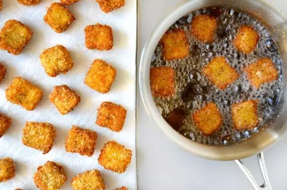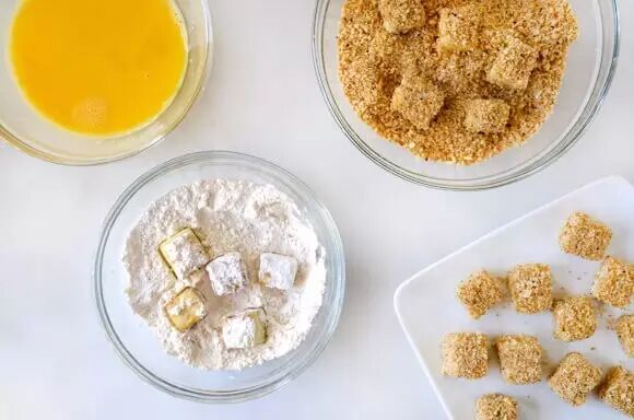 2、鸡蛋打成蛋液,把切丁的茄子分别在蛋液、淀粉、面包屑里滚一遍,放在碟子里备用。