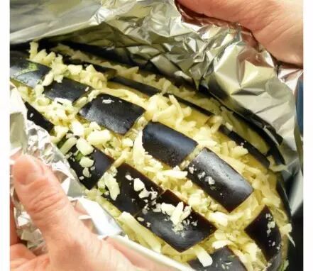 3、将芝士切成小碎片,与蒜末混合,均匀撒在茄子里,用锡纸包好,放进微波炉或者烤箱。