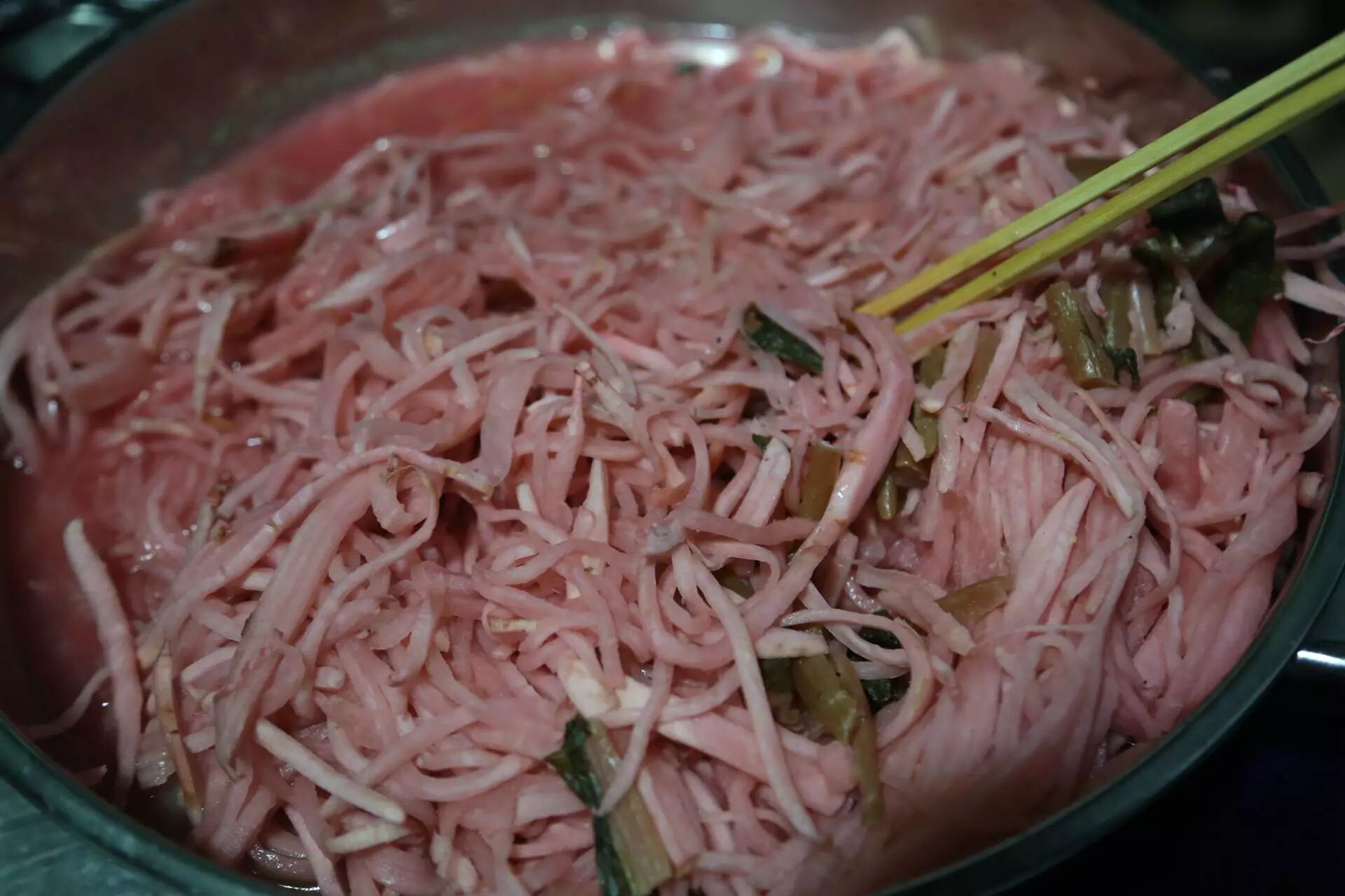 比较起来,富源酸菜确有独到之处。首先,做法上,地道的富源酸菜是先取上好的萝卜和小油菜为原料,没有小油菜才用青菜替之,就连萝卜缨也不扔掉。先烧一锅开水,加放少量淀粉和面粉,分别将洗净切成细丝和小段的萝卜、菜缨放进去炸一下,捞起装入缸内,然后盖好盖子置于火炉旁,一夜即酸,第二天便可食用。不但制作周期较普通的咸菜短了许多,而且用不着放任何佑料,纯纯的原汁原味。新做的酸菜里通常还要加入少许“引子”,也就是陈酸菜的酸汤,当地人称之为“脚子”的那种。各家做出的酸菜味道又不尽相同,就全是这“脚子”使然。因为“脚子”里各种微生物群落的生成复杂多样,做出来的酸菜自然也就稍有差异,这就像四川人做的卤菜因那陈年老卤的不同而色香味各异一样。所以,初学做富源酸菜的人,一定去那做得好的人家要一碗酸汤作自家的“引子”。