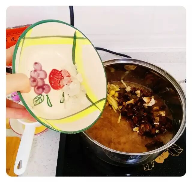 将梨蓉汁倒入锅中,加入姜丝、罗汉果~