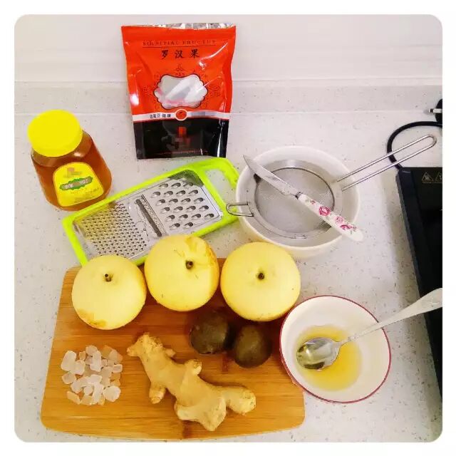这里制作的秋梨膏属于简易版,秋梨膏的配方有很多种,我们选用了最基础也最家常的一种配方,准备材料有:梨、罗汉果、姜、冰糖、蜂蜜。您也可以根据自己的情况添加其他辅料。
