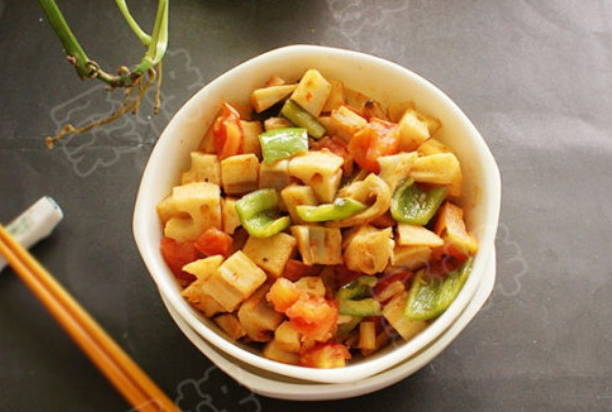 3、锅中坐油烧热,下入鸡腿菇和面筋煸炒1分钟后,倒入青椒、藕丁翻炒半分钟,并加入西红柿再炒半分钟,加入所有调味料炒匀即可。