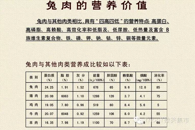 现代研究表明,兔肉具有高蛋白(含蛋白质23~25%)、高赖氨酸(赖氨酸占蛋白质的9.6%)、高消化率(达85%)、高烟酸(高达12.8毫克/百克);低脂肪(仅为1.91%)、低胆固醇(为65毫克/百克)、低热量等特...