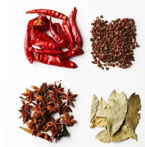2、准备好配料,八角跟花椒,香叶干辣椒都可以稍微备用一点,味道会更香,这些提味的香料都是需要的。