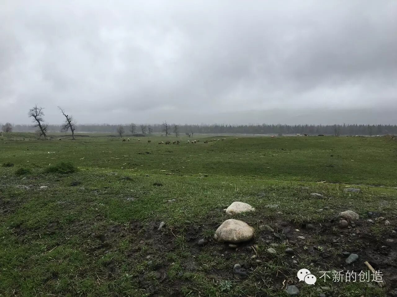 可要说最最让我难忘的美食,还是在新源县。那一天我们先去了一个叫阿勒玛勒的乡,目的是去看苹果花。新疆拥有亚洲最大的野生果林,包括野苹果林、野杏林、野核桃林、野扁桃林、野李群系、野樱桃群系等 6 个类型,其中新源县有野苹果保护区,「阿勒玛勒」在哈萨克语中就是苹果的意思。谁知下大雨,上山的路十分泥泞,我只在一片雨幕中简单拍了照片就折返了。随后我们前往那拉提镇,准备看看那拉提草原的景色,但一样是暴雨如注,车外的强风吹得人头疼,还冷得够呛,啥都顾不上,只想回酒店弄干衣服。明明「那拉提」的意思是「有太阳的地方」,可这儿年降雨量达到 1000 毫米,在整个新疆都算多,所以遇到大雨并不稀奇,它应该改名叫做「有雨的地方」才对。有小伙伴冒雨下车去体验哈萨克驯鹰表演,我乖乖坐在车里观望了一下,据说那个是雕,猛禽犀利,要驯养一只非常不容易。后来雨越下越大,温差导致玻璃起雾,视线变得模糊。尽管如此,我还是在归程中隔着车窗看到了很棒的景色,奔突流动的溪水,霭霭浓密的针叶林,青翠欲滴的蒿草,恬静悠闲的牛羊,忽然就想到了新疆作家李娟笔下的景色。如果有机会,希望能在它花开遍野的时候再来。