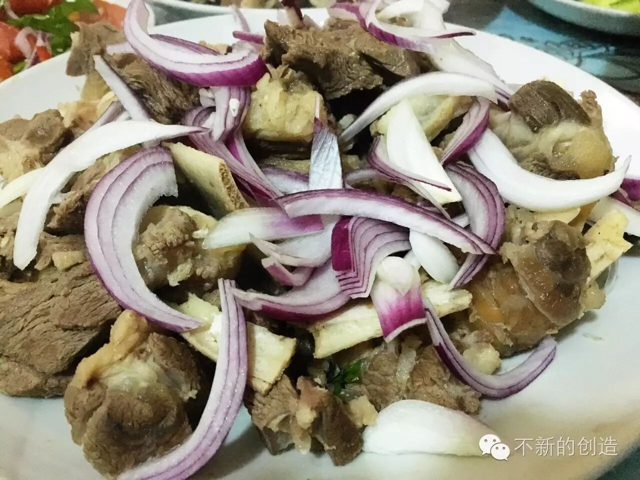 接下来,高能的手抓羊肉上来了!两大盘,冒着腾腾热气,鲜香迎面袭来。老板把一大盘新疆洋葱(当地人叫「皮芽子」,比关内吃到的洋葱个头要小、味道要甜)倒下来,呼啦啦和羊肉拌在一起,开吃!我们迫不及待地伸手,真的是手抓才有滋味啊。那个羊肉,是我迄今吃到的最好吃的羊肉,没有之一。肉的纤维紧致,入口微微弹牙,一点膻味都没有,纯粹的肉香,咬下去有饱满的清汤汁,让人完全不想说话,只想充分咀嚼,感受羊肉在口腔里舒展开来的美妙。老板说别的调料都没加,就放了一点点盐,可那羊肉本真的味道,是多么丰富多么醇厚啊。