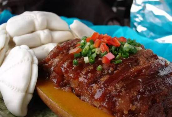 3、南瓜去籽对剖切成船形上笼蒸半小时,将蒸好粉蒸肉扣在蒸熟南瓜上,加小葱淋热油,摆上荷叶饼即成。