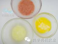 3.取一只鸡蛋蛋清、蛋黄分离,蛋清分成两份,里面分别加入适量玉米淀粉,一份蛋清里加少许红曲粉。