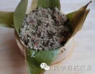 7.棕叶用开水烫过,铺在圆笼里,将拌好的排骨与米一起放入圆笼中