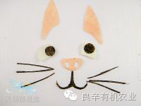 9.取一些黑小米饭用手搓成长条从中间截成两段做汤姆猫的眉毛。