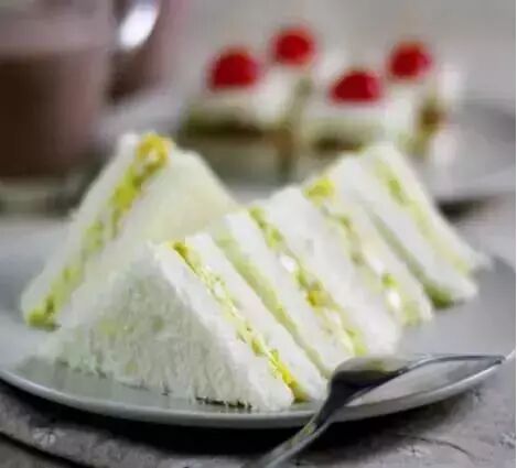 4)将牛奶土司片放入烤箱2面烤黄,2片面包片之间依次叠加上西红柿片、芝士片、生菜、鸡蛋,对切成2半即可。