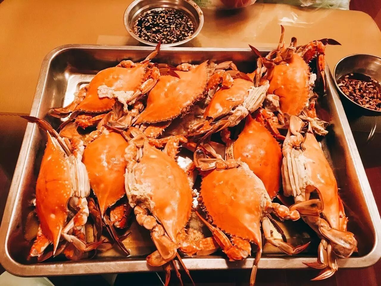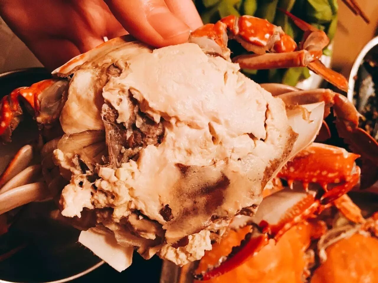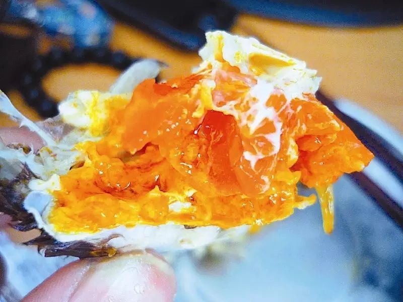 把它们都翻个身,就是红瓦瓦的一片,因为螃蟹太肥,有些时候会在蒸煮过程中发现一些白色的肉,也可能这就是多余的脂肪,味道比蟹肉还鲜美。小时候我就拿筷子,在煮好的螃蟹锅里找这些“边角料”,感觉赚了~