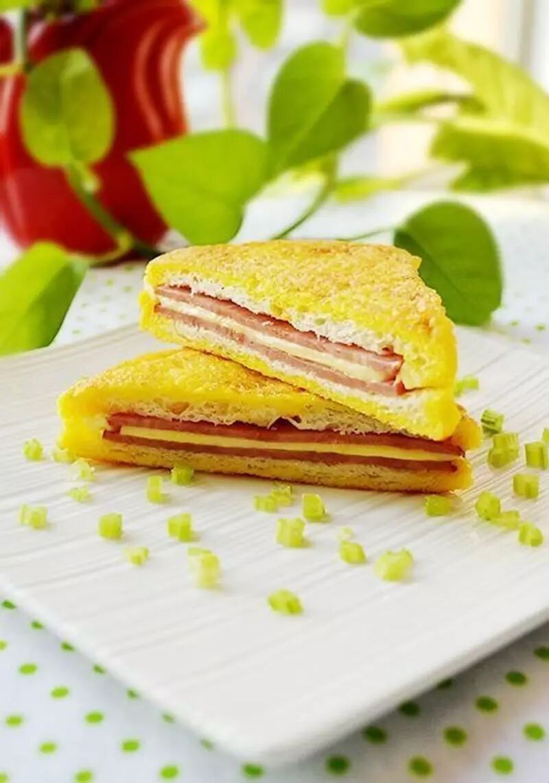 【西多士】 材料:土司2片、火腿片2片、芝士1片、鸡蛋1个(打成蛋液) 做法: 1、准备好土司、火腿片、芝士,鸡蛋打散备用。 2、圆片的火腿切掉一点边,铺在一片土司上。 3、芝士片放在火腿上。 4、另一片火腿切掉两边后铺在芝士上面。 5、再盖上一片土司。 6、把土司边切掉。 7、放在蛋液里两面沾上蛋液。 8、 平底锅放少许油烧热,两面煎至金黄,出锅切成三角形装盘,撒上芹菜碎装饰即可。
