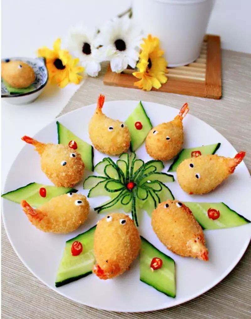 【芝心虾球】材料:明虾10个,芝士三片,黄瓜制作调料:面包糠一碗、鸡蛋一个、咸盐少许,干淀粉适中、沙拉、黑芝麻 做法:1、准备材料,明虾10个、面包糠、芝士片、黄瓜。2、处理明虾,去头去虾线,一定要将虾尾留下。3、处理干净的明虾先裹一层干淀粉。4、在裹上干淀粉的明虾上裹上芝士片,用牙签插好这样比较好固定,浇一层鸡蛋液,在裹上面包糠。5、把第一遍裹好面包糠的红虾再次浇一层蛋液,再过一次面包糠,裹成虾球就可以了。6、裹好的虾球入锅炸制金黄出锅即可。7、切黄瓜,切两道,第三刀切断。8、中间一片弯过来折成黄瓜花。9、另一半斜刀切片,红辣椒装饰。