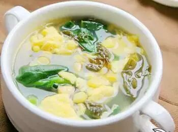 2. 热锅凉油、倒入蛋液炒碎鸡蛋,放入甜玉米和开水,汤烧开后放入紫菜,最后出锅前放入木耳菜再次开锅放点盐,香油即可。