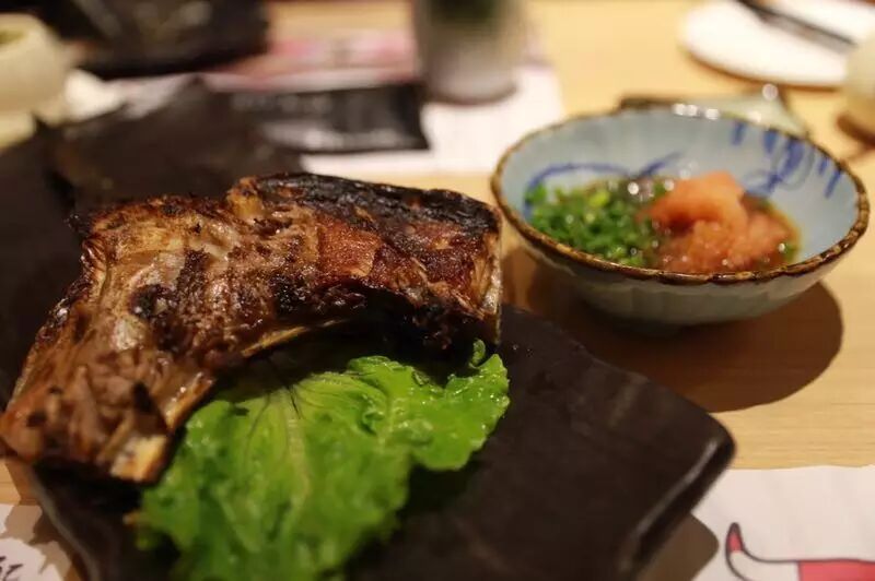 这个是金枪鱼很好吃的小众的部位,只有懂的人才会吃,每条金枪鱼只可取下两块,肉块成镰刀型,筋肉很韧,鲜味浓郁,最适合烤着吃,很香,也可以蘸上一些萝卜泥酱料。