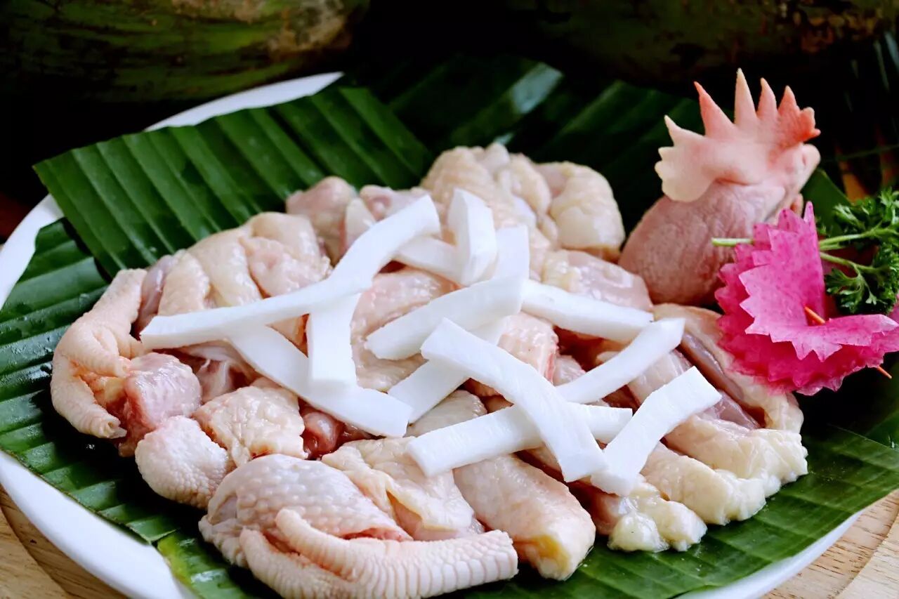 文昌鸡是椰子鸡火锅的主要食材,这只鸡来头可不小,是从海南文昌鸡发源地潭牛镇空运过来的,毛重3斤多,120天放养在当地椰林,30天笼养去腥,据说还能飞上树。鸡肉看起来非常新鲜,骨头里还有渗血迹。