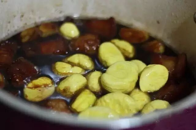 8.五花肉焖煮期间,当汤汁剩下三分之一时加入栗子,拌匀后继续焖