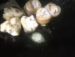 5.翻炒上色,调入五香粉、生抽、老抽、料酒、盐,炒5分钟.加入花生、香菇,炒5分钟.