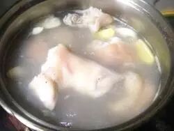 6.倒入高压锅.加入清水,水量以浸过猪蹄为准,盖盖子,开大火,锅上汽后,转小火炖20分钟.