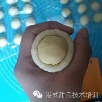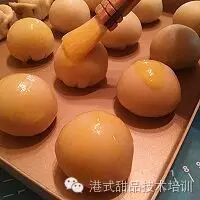 5. 豆沙陷分成20克每个。压成片装包裹1个鸭蛋黄~滚圆备用。