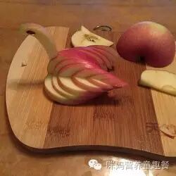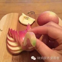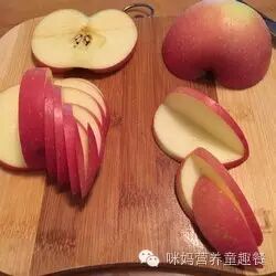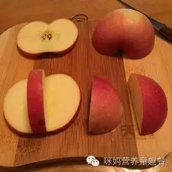 2.将苹果从中间切开,再切成下图所示这个样子。可不要切段咯!