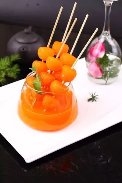 3、成菜后将泡好的梨球用竹签串好,装盘即可。