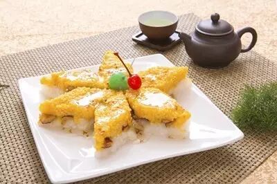 2、烧肉:选用五花肉方块,加香料、葱、麦芽糖,煮30分钟,切片,炸成金黄色。