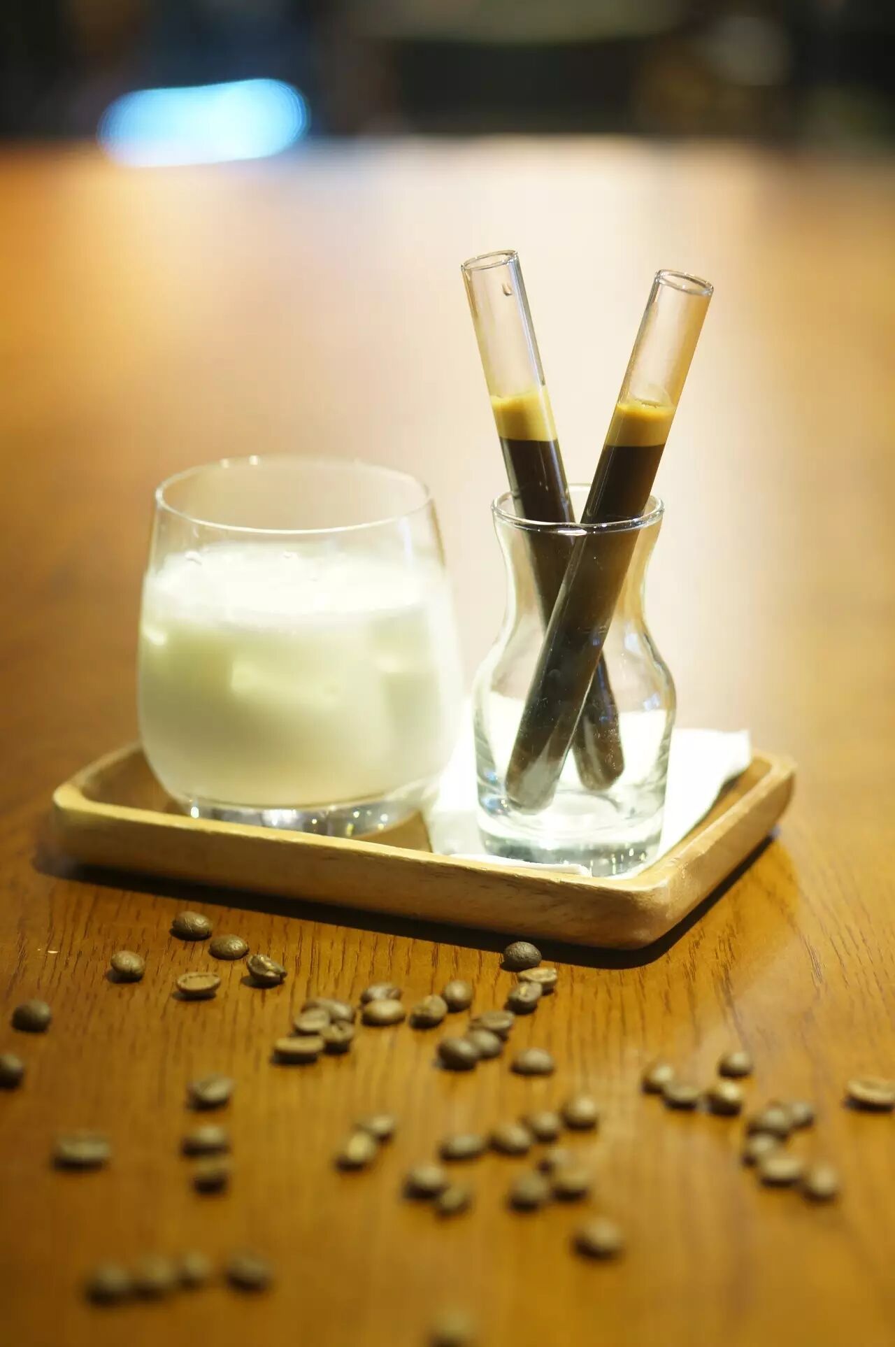 咖啡与牛奶注定天生一对,牛奶的清甜让原本醇厚浓郁的浓缩咖啡,产生滑润柔美的风味。遇上喜欢搞创意的咖啡师,体验就大不同了。冰块放进牛奶,ESPRESSO装入试管,彷佛即将完成一场伟大的科学实验。轻轻地将试管里的咖啡倒进牛奶中,还可以根据个人口味添加咖啡,用咖啡勺优雅地充分搅拌,接下来请享受它的独特体验感……