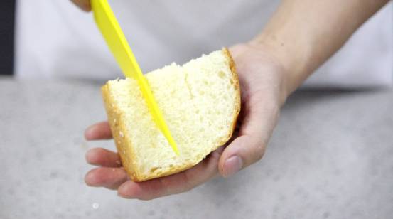 取一块面包,在如图所示的位置切两刀,用来填入奶酪馅。
