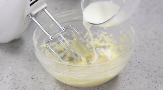加入牛奶搅打均匀,再加入奶粉搅打均匀。