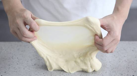 将制作面包的所有材料混合揉成面团,然后用力揉面,一直将面团揉到可以抻出薄膜的扩展阶段。因不同面粉的吸水性不同,请根据实际情况调整牛奶的用量,使揉好的面团达到非常柔软的程度。
