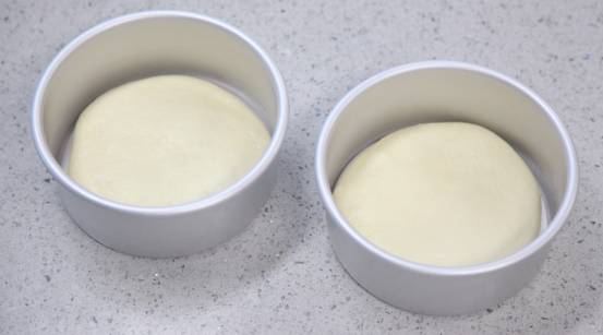 在圆形6英寸蛋糕模内壁涂抹一层薄薄的黄油防粘(配方分量外),然后把面团放在蛋糕模里,将面团进行最后发酵,直到发到模具的8成满(最佳发酵环境:温度35-38度,湿度85%)。