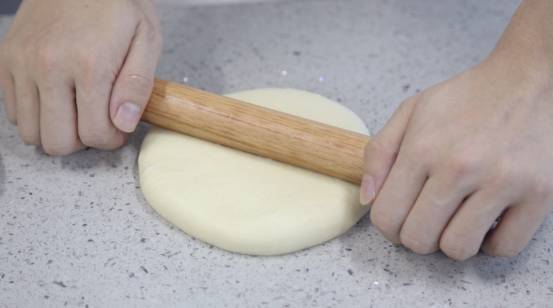 将面团压扁,用擀面杖擀开成为圆饼状。