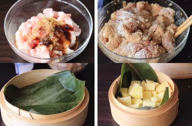 3、在蒸屉中放上新鲜的粽叶或者干净的纱布,码上土豆块,然后将猪肉均匀地放在土豆上,用大火蒸30分钟左右,取出,撒上葱花和红辣椒就大功告成了。