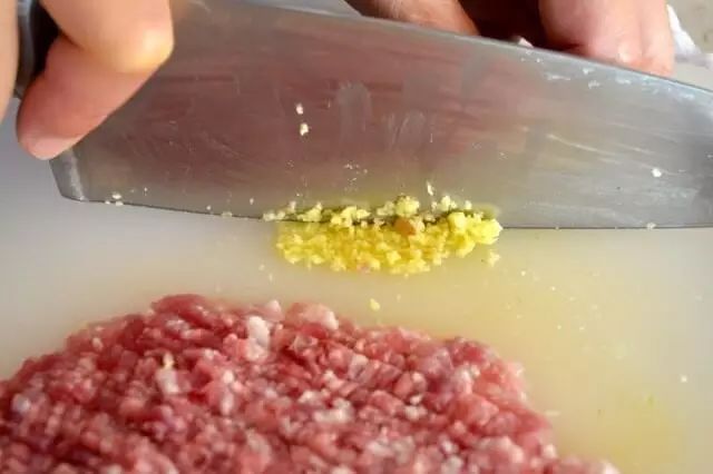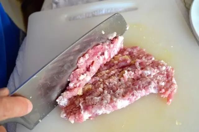 2、猪肉剁碎,把咸鱼切末,加入肉末中,并且加入料酒、盐、糖、白胡椒粉搅拌上劲,成馅