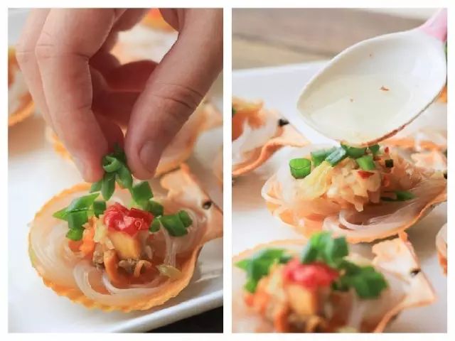 5、扇贝放入锅中蒸8分钟,取出,淋上热油和葱花,粉丝蒸扇贝就做好啦~