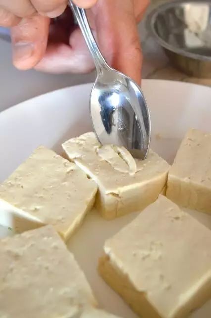 1、豆腐洗净切成块,用小勺子挖去中间的部分