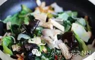 1.木耳、腐竹事先用清水泡发,木耳清洗干净后去掉根蒂,撕成小块、腐竹切小段
