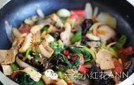 9.加入蟹柳、香肠和焯熟的鱿鱼卷和虾仁煸炒