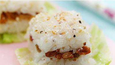 用料:米饭1碗、核桃(干)20克、枣(干)20克、葡萄干20克、白砂糖10克、白芝麻5克、黑芝麻5克