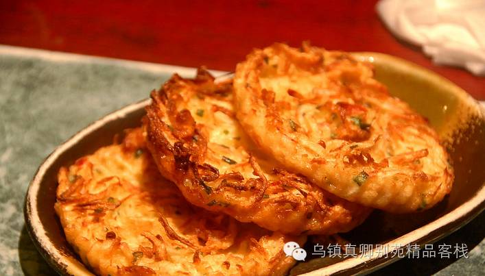 萝卜丝饼乌镇的经典美味,乌镇俗称油墩子。将萝卜洗净刨成丝,用少许食盐略腌后,挤去水份,放入葱末拌匀。另用面粉和冷水调成浆糊状,再用白铅皮做成的椭圆形模勺,底层铺满粉浆,放入萝卜丝,再用面浆封面,放入油锅内煎成金黄色脱模即成,食时美味可口。