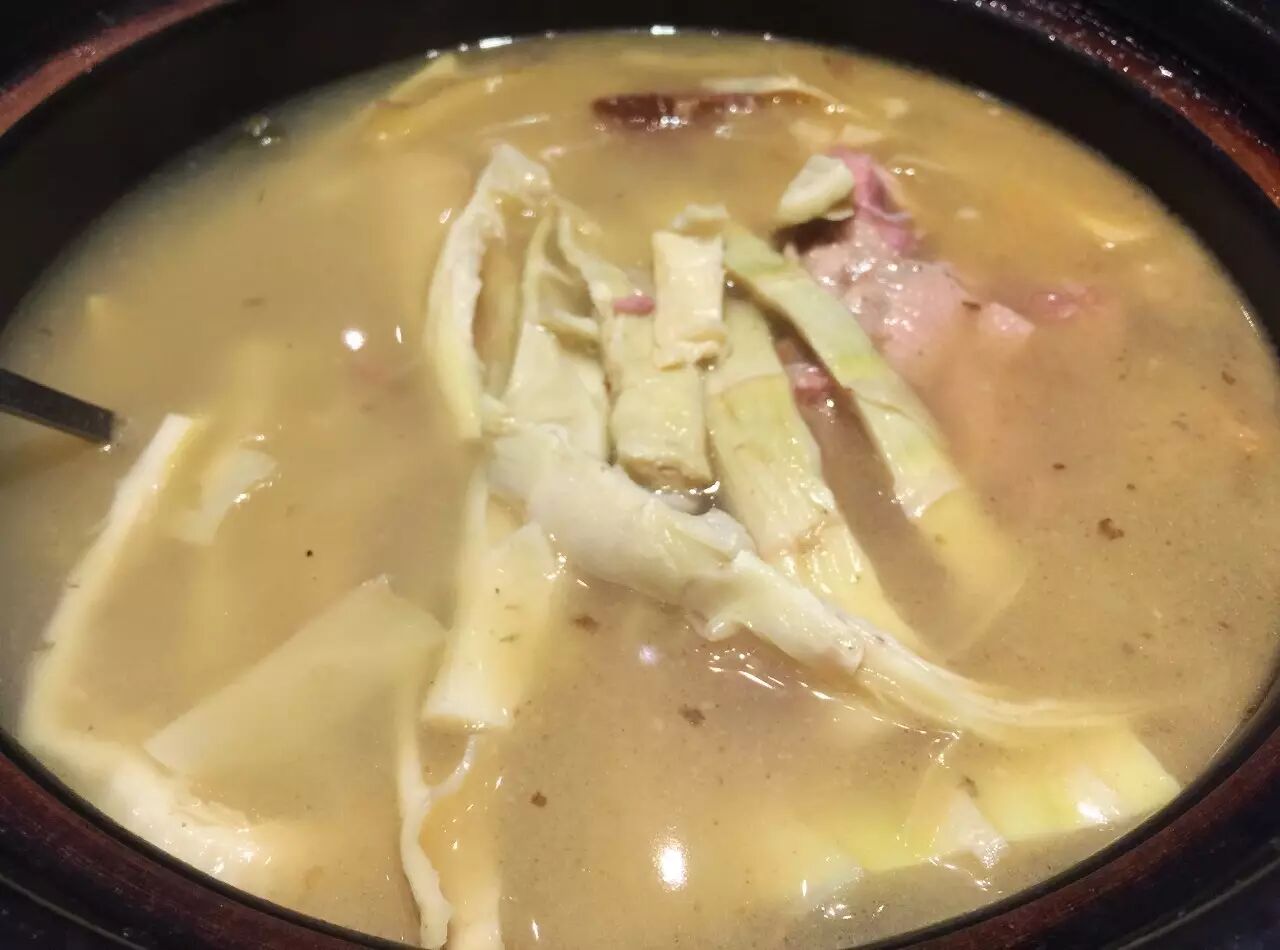 招牌老鸭煲采用隔年老鸭、天目山笋干、陈年火腿、野山粽叶等原料文火慢炖四五个小时制成,鸭肉酥而不烂,食材滋味浸入鸭汤,汤头浓郁,油而不腻。