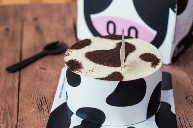 不光是包装盒,整个蛋糕也被做成奶牛样式