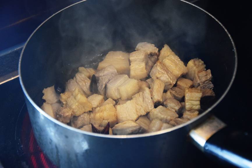 7.加入适量老抽炒色,然后加水没过肉,放入适量白砂糖。