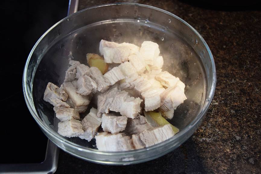 3.将五花肉冷水下锅,加入姜片,葱段,料酒去腥。