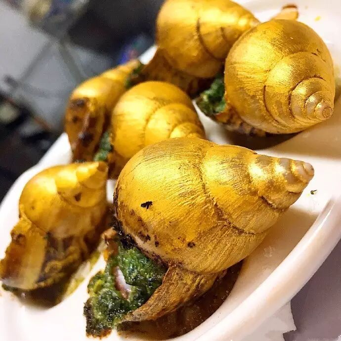 【24K金焗蜗牛】很多朋友表示好奇,当然,噱头是足够的,但是不可否则的是,它的确很美,导致吃完螺肉也舍不得丢弃壳,味道很细腻。