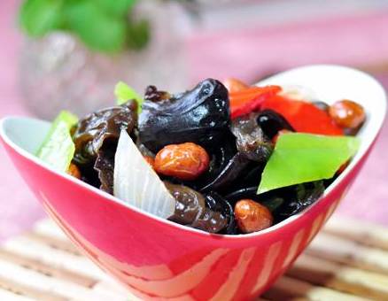 材料:水发木耳150g,洋葱1/4个,绿尖椒+红甜椒共1个,油炸花生米适量